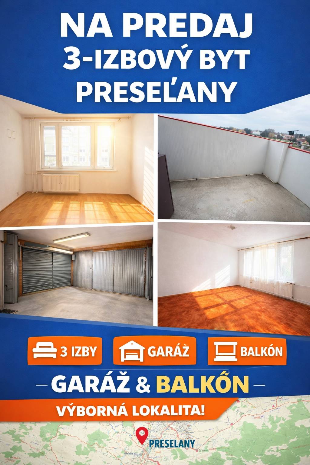 Realitná kancelária TOREA Topoľčany ponúka exkluzívne na predaj priestranný 3-izbový byt v obci Preseľany, ideálny pre rodinu s deťmi alebo pre každého, kto hľadá pokojné bývanie mimo ruchu mesta. Byt sa nachádza na 2. poschodí zatepleného bytového domu a má výmeru 75 m². K bytu patrí balkón o...