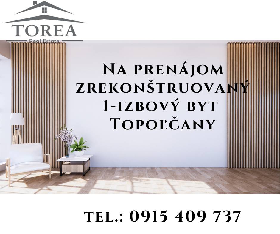 Realitná kancelária TOREA predstavuje - prenájom príjemného zrekonštruovaného, svetlého 1- izbového bytu v Topoľčanoch. Ide o priestranný jednoizbový byt s veľkosťou 36m², ktorý je pripravený na nových nájomcov. Tento byt je vhodný pre jednu až dve osoby a ponúka všetko, čo potrebujete na...